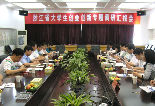 夏晓军副院长向调研组汇报了我院大学生创业教育体系建设方面的情况。我院坚持育人为先,把“敢为人先、特别能创业”的温州人精神教育引入学生素质教育中,秉承“厚德、长技”校训,努力培养学生的创新精神和创业能力,积极构建富有时代特征和高职教育特点的职业素质教育体系。夏副院长围绕“三课三园”建设,即创业教育第一课堂、第二课堂、第三课堂以及精品园、商贸园和草根园的建设,介绍了我院在创业教育方面的主要做法和效果。