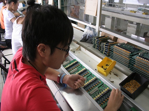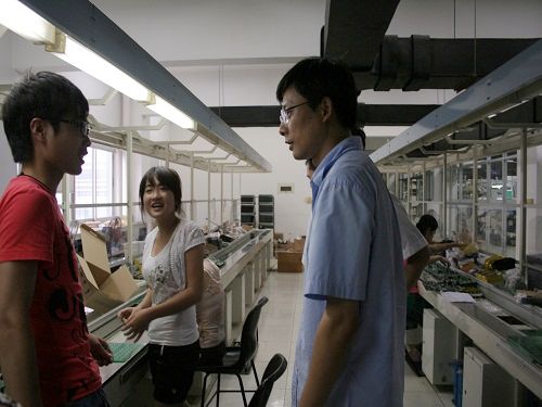 实践过程中,在生产部经理杨仲盛的安排下,九个人分成三小组,由企业党员指导,依次在第一车间、第三车间、SMT车间学习。第一车间是补焊和插件区,学的是基本技术,例如熟练掌握电烙铁的使用、尖嘴钳的正确握法、辨别元器件等。在第三车间,学生可以学到整机组装和调试,尤其是调试部分,蕴含了大量的理论,通过实际操作,加深印象。SMT车间采用了最先进的设备,具有自动流焊、自动贴片等一系列功能,高新的设备让同学们大开眼界,使其领悟到学好专业的重要性。