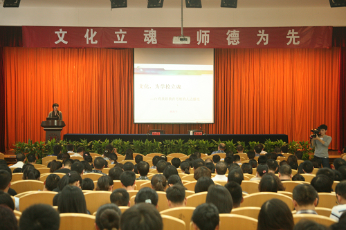 10月16日下午,我院在明德楼树人堂举行了主题为“文化立魂、师德为先”的校园文化建设系列报告,分别由林海平教授和贾妍教授为大家带来题为《文化,为学校立魂—台湾技职教育考察的几点感受》和《我对学院教风的理解》的精彩报告。全院教职员工参加了本次报告会。