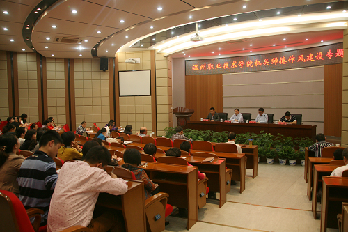院机关师德作风建设专题会议10月23日下午在正德楼罗山厅进行。会议主题是贯彻落实学院有关师德师风建设会议精神,在机关中开展“一训三风、爱岗敬业、服务奉献”为主题的师德作风建设宣传教育。学院党委副书记夏晓军作重要讲话,机关全体党员、科长及以上干部参加会议。