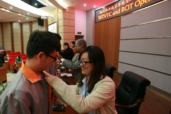 在教师代表和学生代表发言之后,两校领导一同为2013级中加班新生佩戴了BCIT校徽并合影留念。
