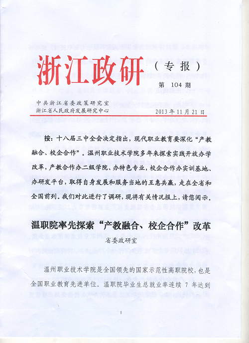 近日,省委政策研究室、省人民政府发展研究中心以专报形式向省委省政府汇报我院改革发展的先进经验。专报认为,温州职业技术学院多年来探索实践开放办学改革,产教合作办二级学院、办特色专业、校企合作办实训基地、办研发平台、取得自身发展和服务当地的互惠共赢,走在全省和全国前列。