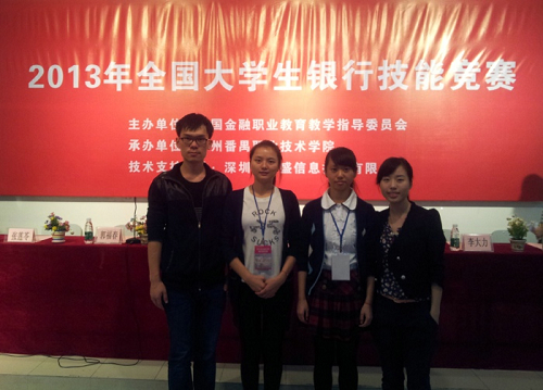 本次比赛由全国金融职业教育教学指导委员会主办,这是该指委会成立后举办的第一届比赛,也是目前国内最高级别的大学生银行技能竞赛,共吸引了来自全国84所高职院校的252名学生参加竞逐。竞赛分为综合业务技能和单项业务技能,经过激烈角逐,财会系学子一路过关斩将获得团体二等奖;金融1102魏碎玲获得点钞项目二等奖;金融1102潘翔翔获得传票算项目三等奖;金融1201陈乐强获得字符输入项目三等奖。