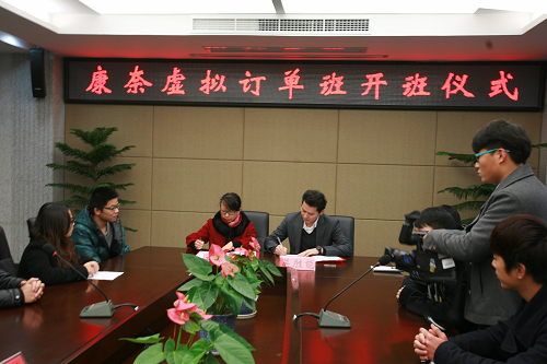 1月8日,我院与康奈集团在学院技术研发大楼三楼会议室隆重举行康奈虚拟订单班(二期)开班仪式。学院副院长王志梅、招生就业处处长谷智静、副处长金建孟、计算机系书记童炳金以及康奈集团副总裁吴胜能、人事经理任培广、人事主管李秀靖、订单班18名学生等一起出席了开班仪式。