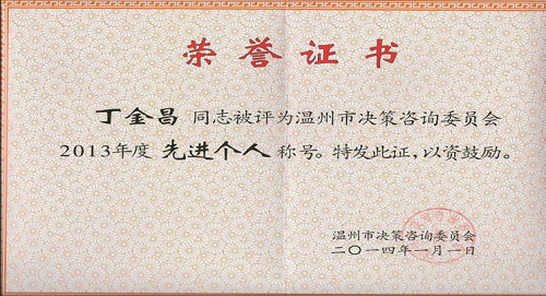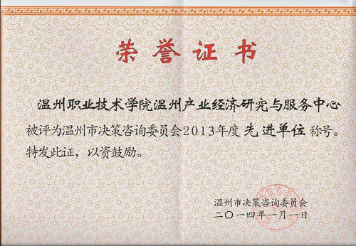 2013年度我院共承担了9项市决策咨询项目,研究成果受到市委市政府的肯定、批示。年会对2013年度先进个人、先进单位与优秀课题进行表彰(温决咨〔2014〕3号文件),我院丁金昌委员被评为2013年度温州决咨委“先进委员”称号;我院陈珉、郑文秀研究员被评为2013年度温州决咨委“先进研究员”称号;我院温州产业经济研究与服务中心被评为2013年度温州决咨委“先进单位”称号,是温州市唯一入选的高职院校,该机构已连续两年被温州决咨委评为先进单位。