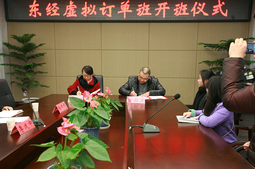 开班仪式上,校企双方领导首先签订了《东经虚拟订单班合作协议》,并聘任招生就业处周建丹老师为订单班班主任。接着,订单班学生代表章显岳发言,他对学院领导和东经控股集团为订单班组建所提供的各项支持与帮助表示衷心感谢,并表示会珍惜机会,学好知识,练好本领,不辜负企业和学院对他们的期望。