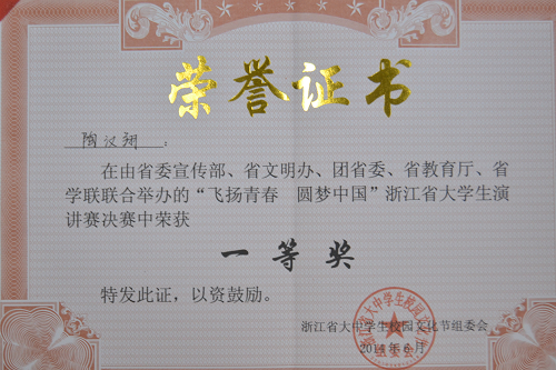 经过“主题演讲”和“即兴演讲”两个环节的激烈比拼,我院学子陶汉翔结合自己的所见所闻,旁征博引,妙语连珠,激扬文字,挥斥方遒,表达了对“青春梦,中国梦”的美好憧憬与现实梦想的坚定决心,凭借《笑靥人生》的演讲深深地打动了台下的老师和同学,赢得了阵阵掌声,一举夺得高职高专组决赛一等奖。