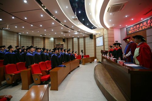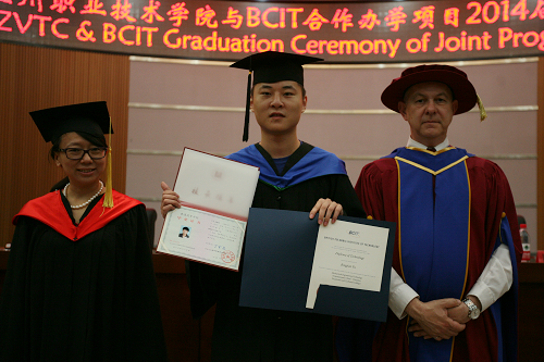 6月30日上午,庄严肃穆的《义勇军进行曲》和《 O Canada 》回响在温职院的校园,学院迎来了2014届中加合作班毕业典礼。毕业典礼在正德楼罗山厅正式拉开帷幕。加拿大不列颠哥伦比亚理工学院(BCIT)校长代表Kim Dotto博士、国际学院院长谷丰博士,我院副院长王志梅、教务处处长张宝臣、机械系主任南秀蓉出席典礼仪式。仪式由机械系系主任南秀蓉主持。