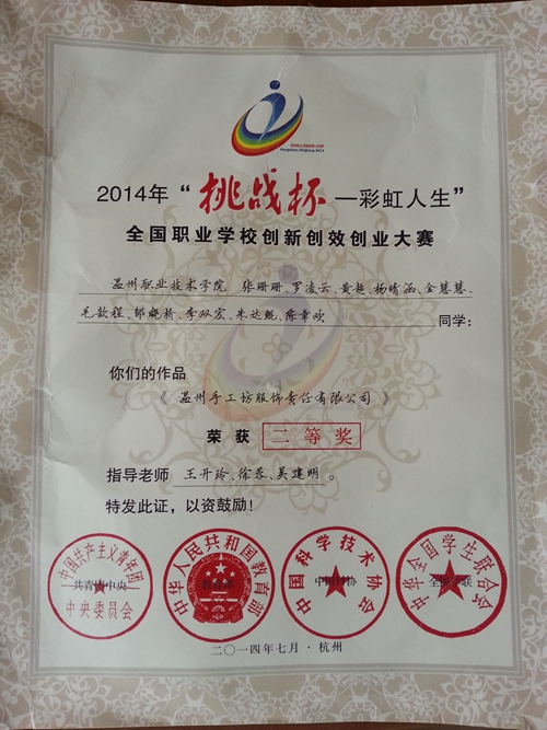 由团中央、教育部、全国科协、全国学联联合主办的2014年“挑战杯—彩虹人生”全国职业学校创新创效创业大赛于7月份在杭州落幕。我院作品《温州手工坊服饰责任有限公司》喜获全国二等奖,为学校赢得了荣誉。