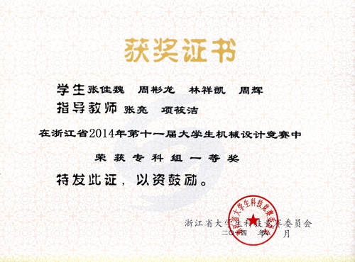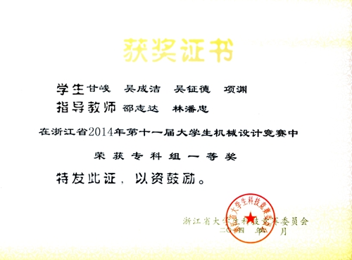 日前,浙江省大学生机械大赛网站公布了4月份在温州大学举行的浙江省第十一届大学生机械设计竞赛暨第六届全国大学生机械创新设计大赛选拔赛成绩。我院机械学子在该项赛事中斩获佳绩,选派的三支队伍全部获奖,其中获得两个一等奖,一个三等奖。