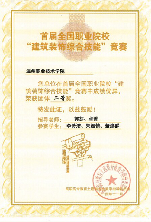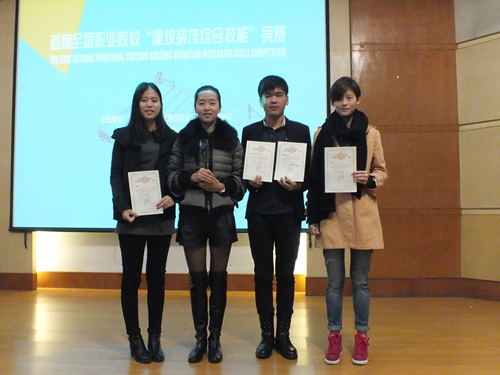 11月14-16日,由高职高专教育土建类专业教学指导委员会主办的首届全国职业院校“建筑装饰综合技能”竞赛在徐州举行,来自全国29支代表队87名选手参加了此次竞赛。经过激烈角逐,由建筑工程系郭芬、卓菁老师指导,李诗洁、朱温情和董煌群三位同学组成的温州职业技术学院代表队以优异成绩获得团体二等奖、建筑装饰施工图绘制单项二等奖、建筑装饰工程算量清单编制单项二等奖。