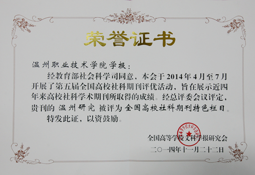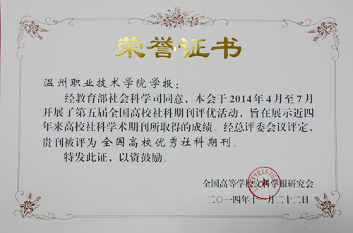 11月22日,全国高等学校文科学报研究会在广州举行第五届全国高校社科期刊评优活动颁奖典礼,中宣部出版局、教育部社科司相关领导到会并祝贺。经教育部社科司批准、全国高等学校文科学报研究会总评委会议评定,我院学报荣获两个奖项,即《温州职业技术学院学报》荣获“全国高校优秀社科期刊”,“温州研究”荣获“全国高校社科期刊特色栏目”。这是我院学报继2012年被评为第五届华东地区优秀期刊奖后的又一殊荣。