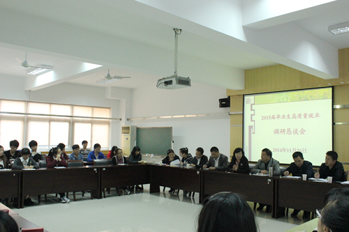 为进一步做好我院2015届毕业生高质量就业工作,了解毕业生就业期望和择业困惑,解决毕业生最关注的就业问题,以更好地服务于毕业生。学院招生就业处于11月26日组织召开了两场2015届毕业生高质量就业调研系列恳谈会,学院王向红副院长,招生就业处负责人,教务处、学生处相关代表,各系学工办主任、就业辅导员老师以及80余名毕业班班长出席了会议。会议由招生就业处谷智静处长主持。