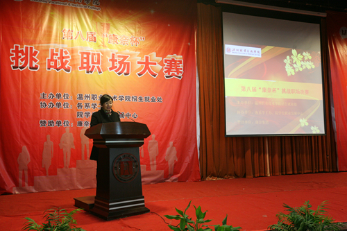 12月3日晚,温州职业技术学院第八届 “康奈杯”挑战职场大赛总决赛在学院明德楼树人堂隆重举行,学院副院长王向红教授亲临现场指导并致辞,她指出挑战职场大赛是将模拟面试与技能展示等环节有机结合,通过大赛让同学们更加清晰地认识自我、确定目标、提高技能、为实现今后的高质量就业和职业发展打下坚实的基础。