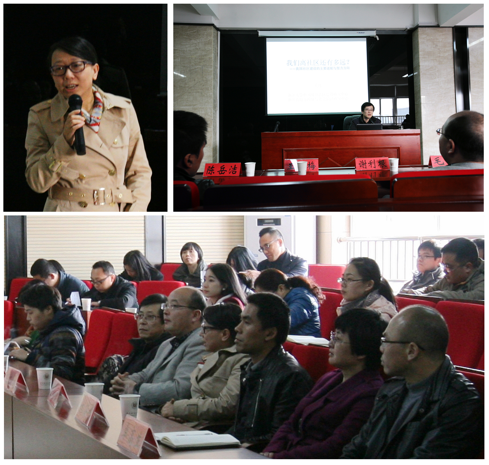 浙江大学公共管理学院副院长毛丹教授做题为《社区建设的现状与未来》的主题报告,毛教授是国内知名学者,研究领域宽广、学术造诣很深。近年来,他关注温州社区建设,撰写的《温州市社区组织及其职能设置》一文荣获民政部2014年民政政策理论研究一等奖。报告中,毛教授将社区比作“社会湿地”, 形象地阐述了社区之于社会的作用,并从理论层面将温州社区建设面临的困境进行梳理;而后,苍南沪山社区主任陈岳洁做《不要让希望等待太久——社区运行现状与对策思考》、丁丽燕教授做《温州城乡社区服务类社会组织探究》的专题发言。最后,参会者就社区服务、社区志愿者队伍建设等展开讨论。